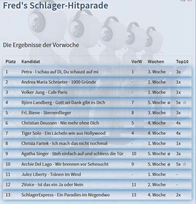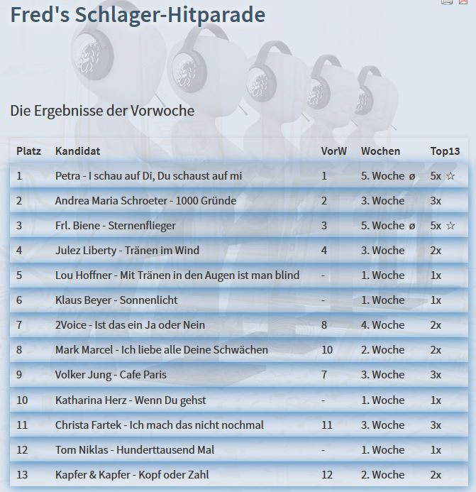 Tränen im Wind klettert in Fred´s Schlager-Hitparade