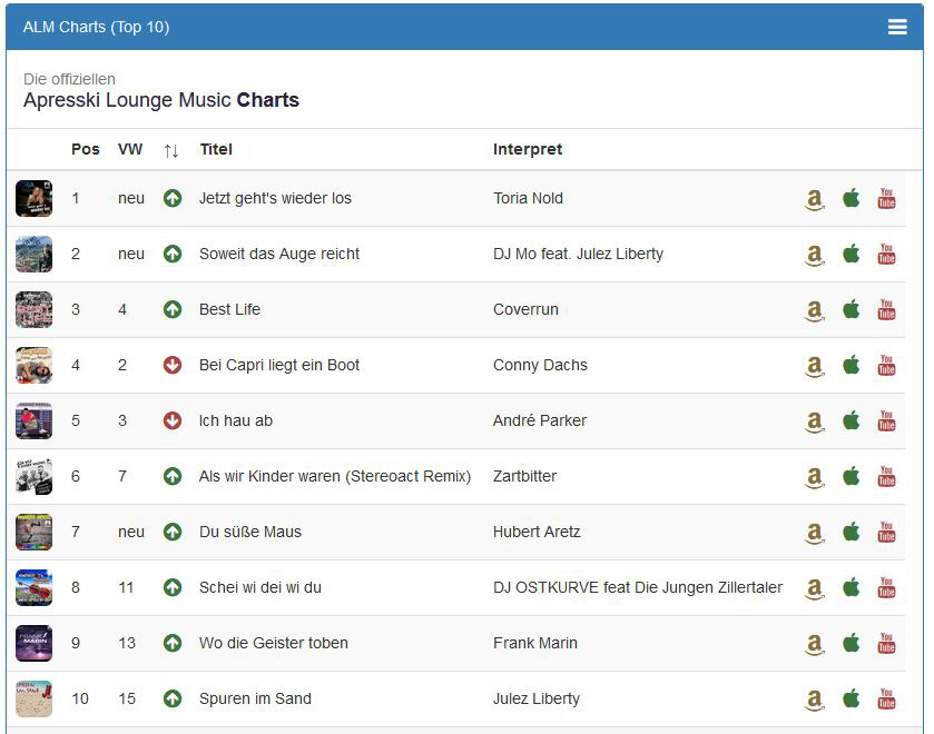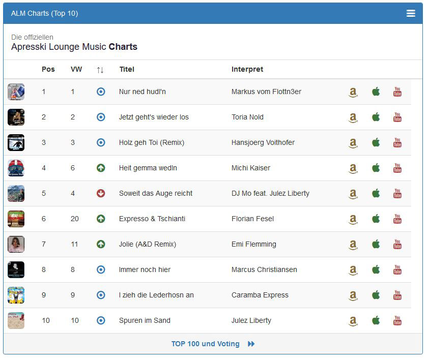 Ihr habt den Titel direkt auf Platz 2 der Apresski Lounge Charts gewählt. Spuren im Sand schafft den Sprung zurück auf Platz 10.